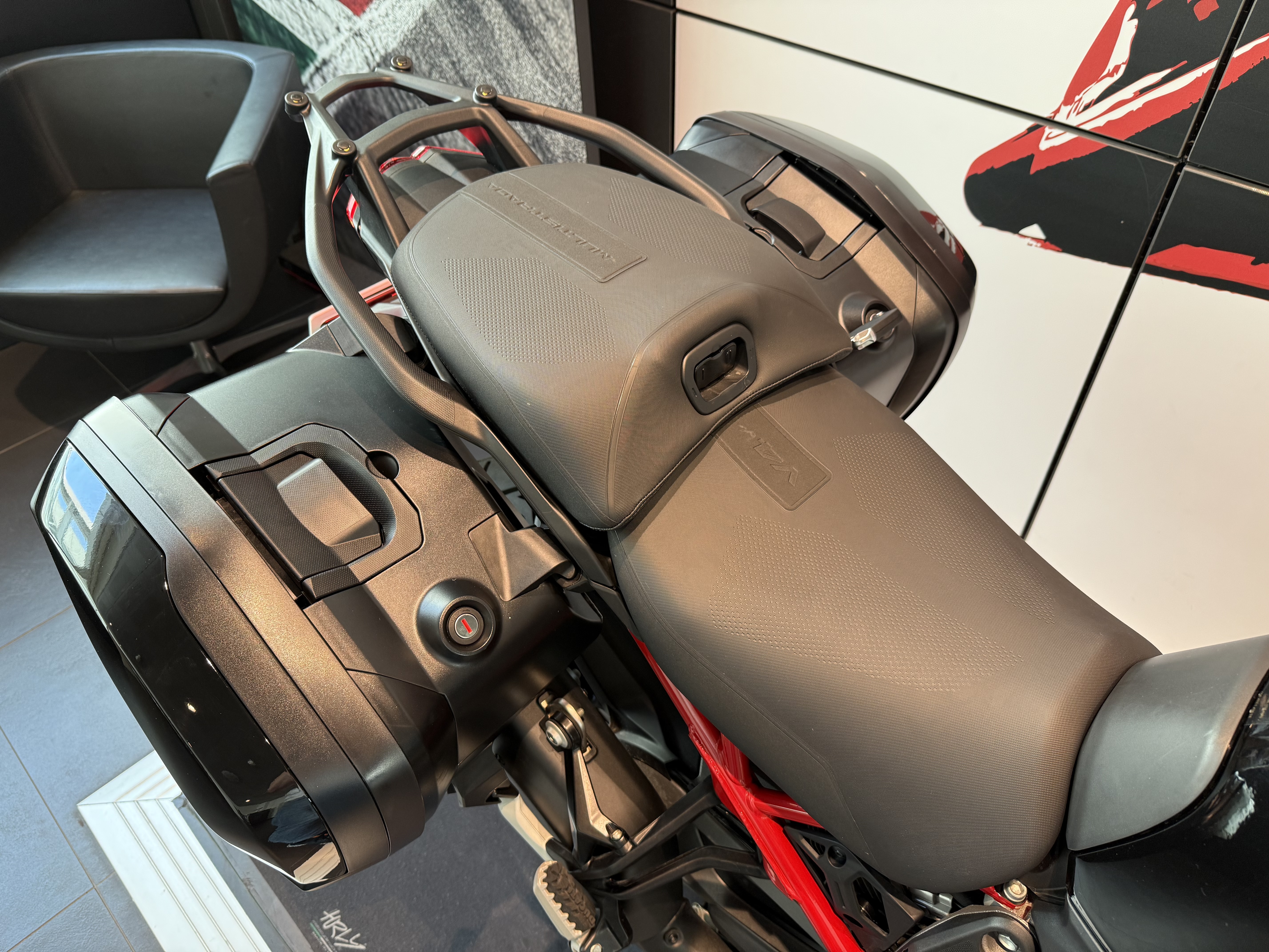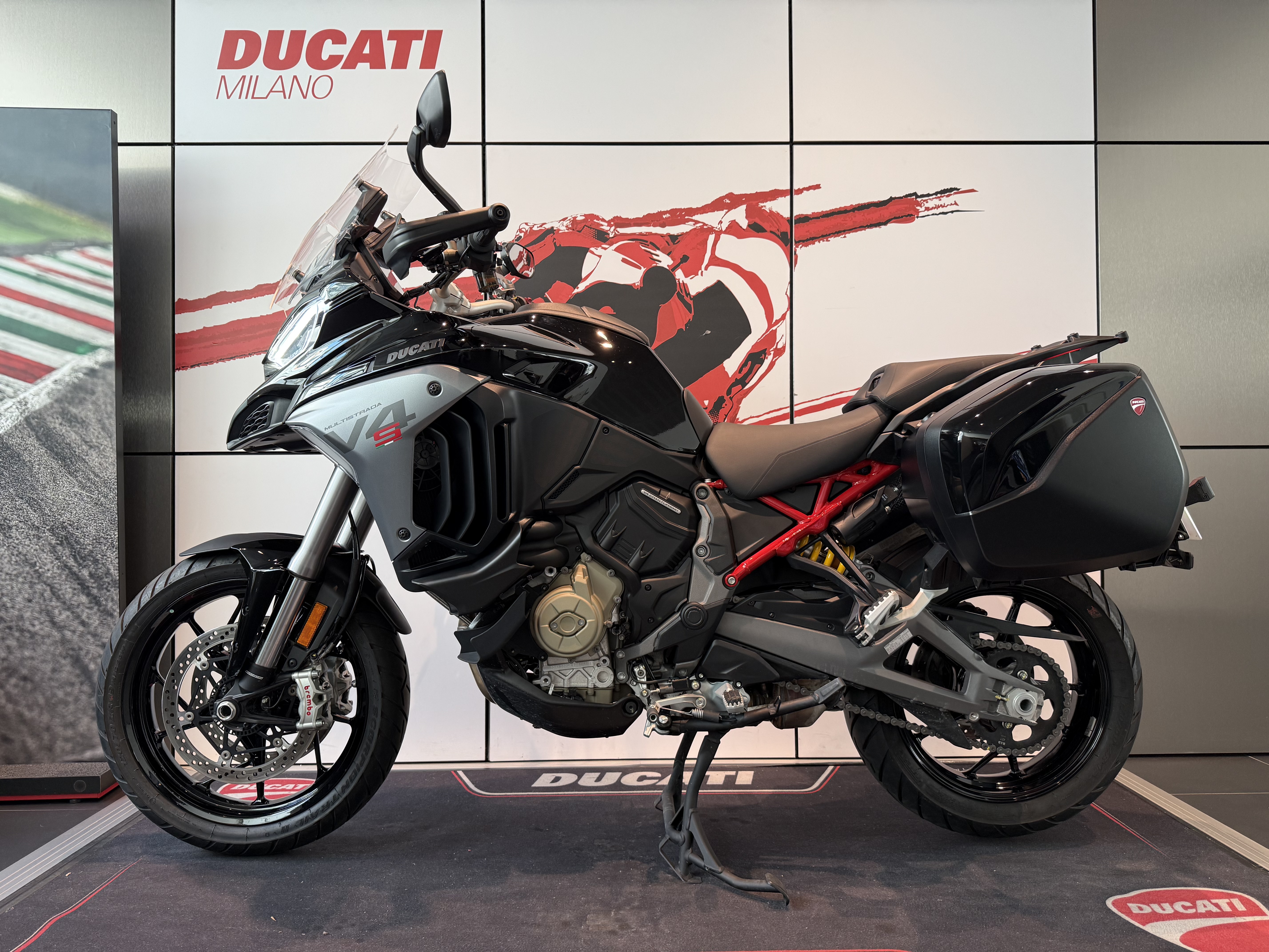 Bellissima Ducati Multistrada V4 S allestimento Travel & Radar - valigie laterali, radar anteriore e posteriore, manopole e selle riscaldate, cavalletto centrale – nella colorazione Thrilling Black.